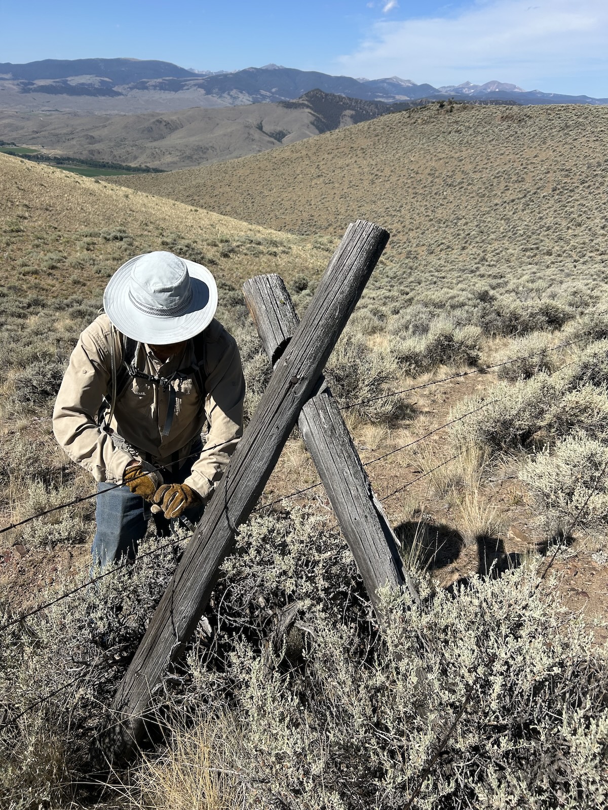 On the weekend of July 26 & 27, 18 volunteers from Montana BHA joined forces with the National Wildlife Federation, staff from the BLM's Butte field office, and a couple of conservation-minded ranchers to remove 2.7 miles of livestock fencing from public lands managed by the BLM near Melrose, MT. The fence in question was over 70 years old and consisted of 5 strands of barbed wire strung up along jackleg posts. This fence design is extra wide and tall, making it difficult for ungulates to clear while leaping. And with barbed wires close to the ground, the fence posed a barrier to pronghorn who prefer to duck under fences, often lacerating their back against the barbs or being turned away entirely. This fence transected an important pronghorn corridor within a habitat bottleneck formed by Interstate 15 to the west and the rugged terrain of the Highland Mountains to the east, in an area that also serves as seasonal range for bighorn sheep, and as vital winter range for elk and mule deer.