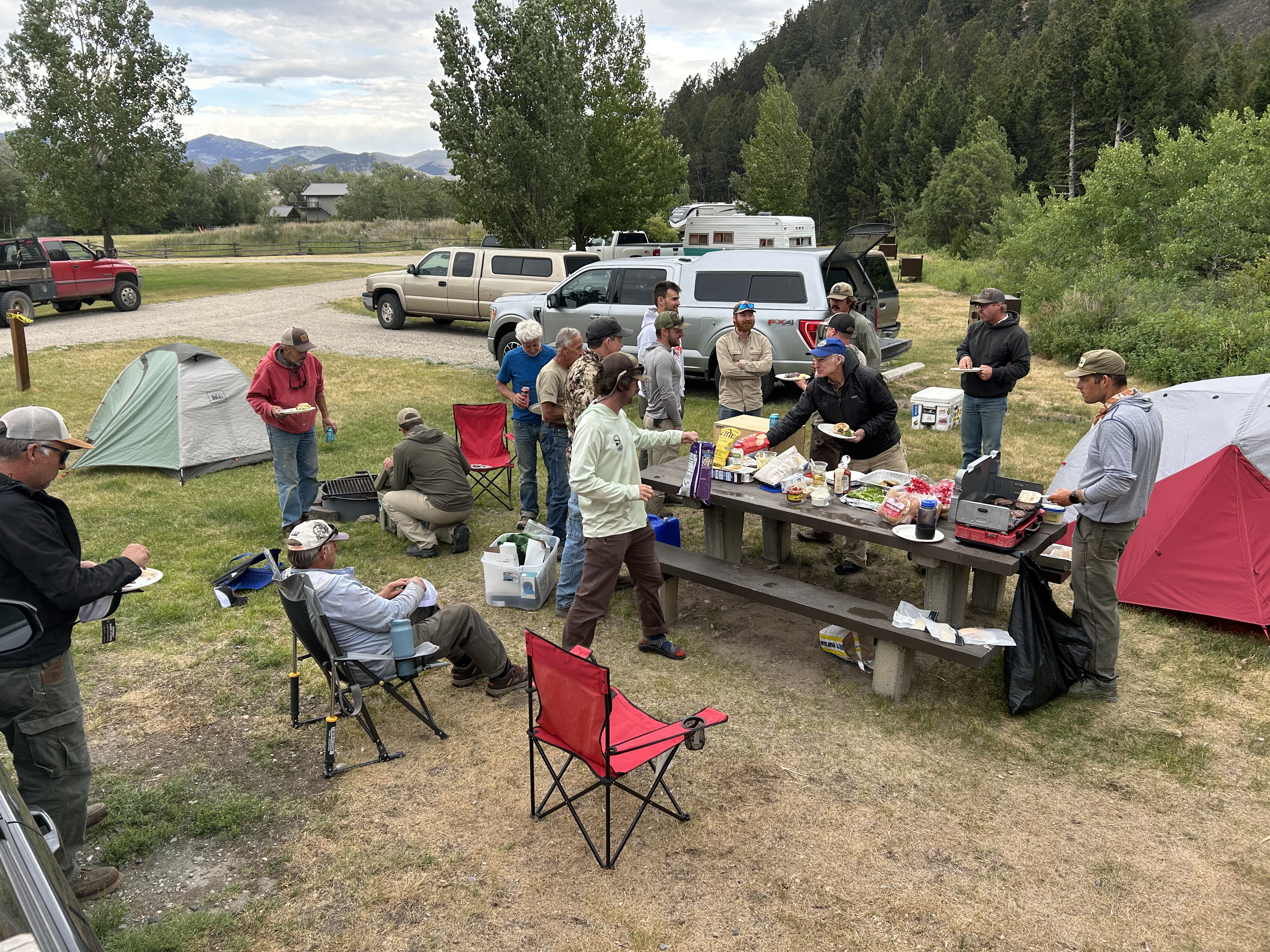 BHA volunteers, ranchers, and BLM staff gathered for dinner after a hard day of pulling fence.